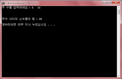그 두수들(2와 11)사이의 소수들(2,3,5,7,11)의 합 (28)이 출력되는 알고리즘이다.